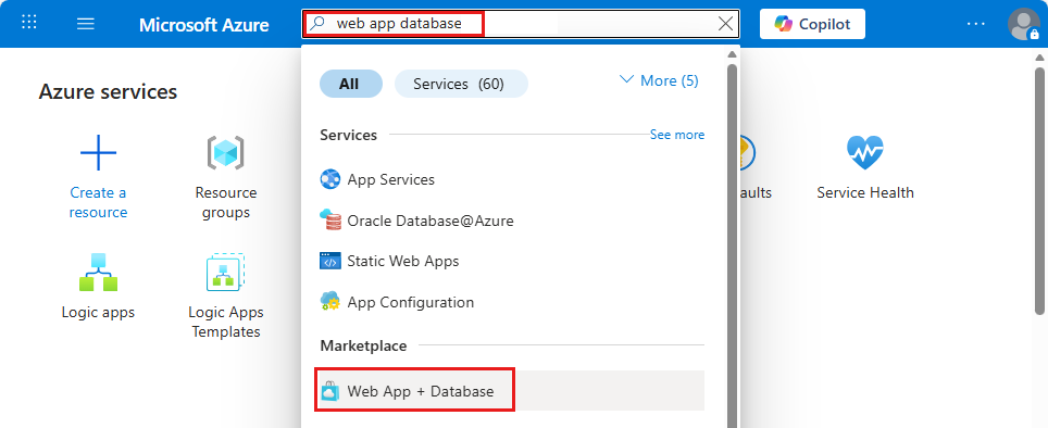 - Wählen Sie unter der Überschrift Marketplace das Element mit der Bezeichnung Web App + Datenbank aus. Sie können auch direkt zu "Web-App erstellen " navigieren.