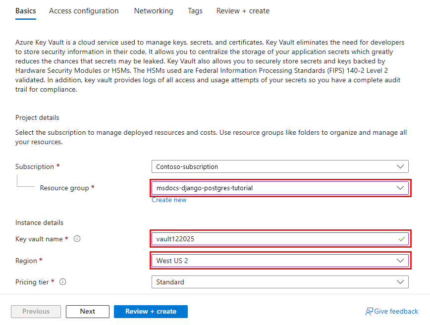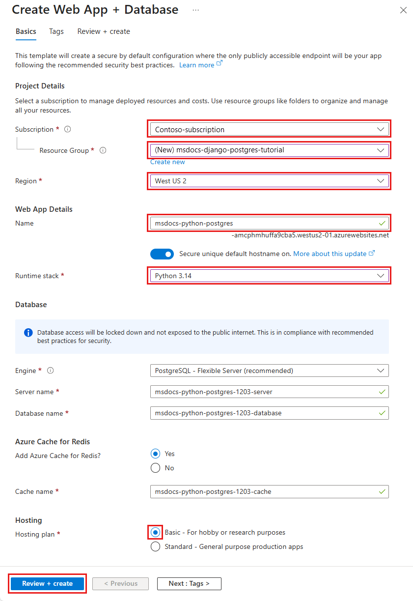 - Ressourcengruppe: Wählen Sie "Neu erstellen" aus, und geben Sie "msdocs-django-postgres-tutorial" ein.