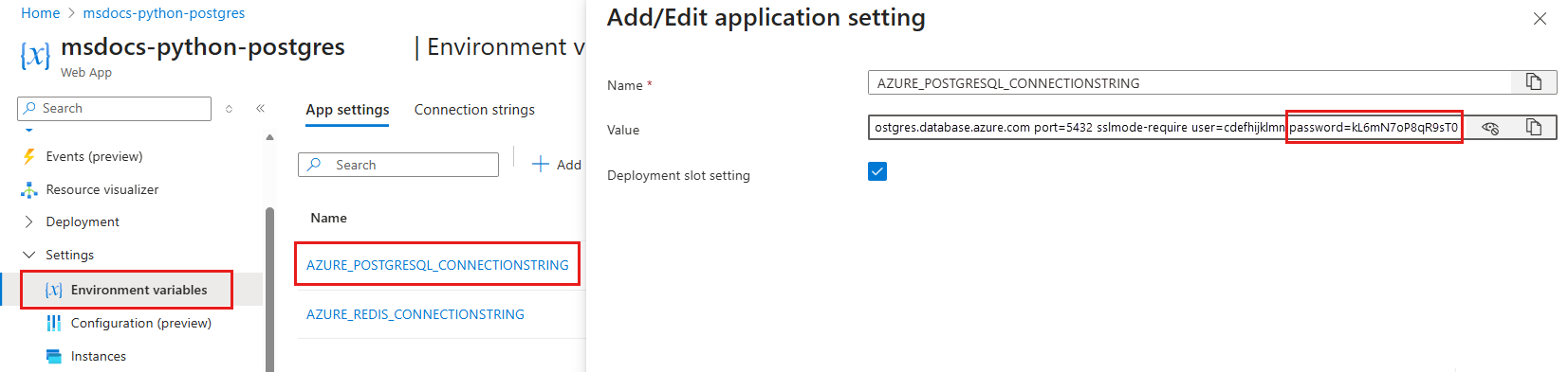 - Wählen Sie AZURE_POSTGRESQL_CONNECTIONSTRING aus.