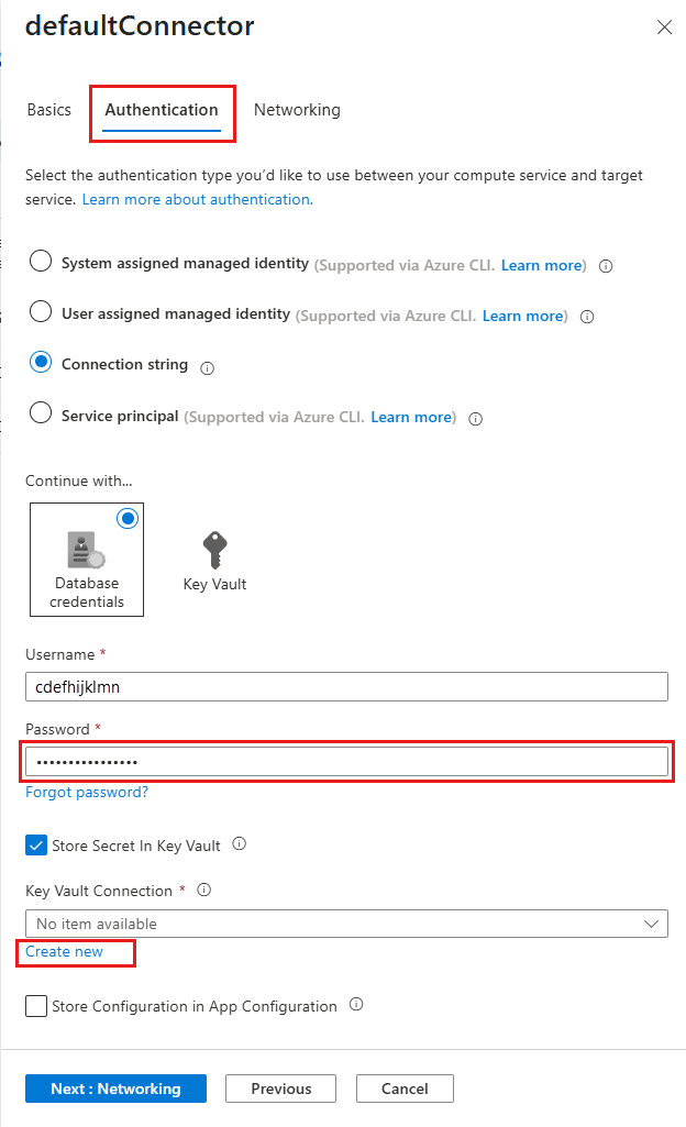 Der Bereitstellungsprozess generiert die Konnektivitätsvariablen für Sie als App-Einstellungen. Die bewährte Sicherheitsmethode besteht darin, Geheimnisse vollständig aus dem App-Service herauszuhalten. Verschieben Sie Ihre Geheimnisse in einen Schlüsseltresor, und ändern Sie die App-Einstellung mithilfe von Dienstconnectors in Key Vault-Verweise.
