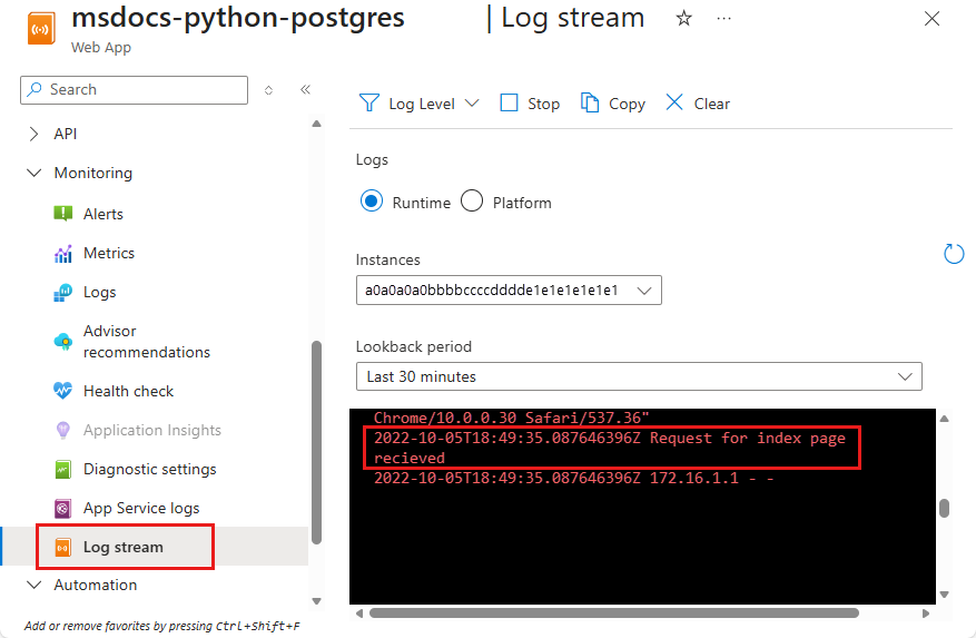 Stream App Service logs at: <URL>