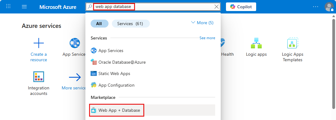 - Wählen Sie unter der Überschrift Marketplace das Element mit der Bezeichnung Web App + Datenbank aus. Sie können auch direkt zu "Web App erstellen " navigieren.