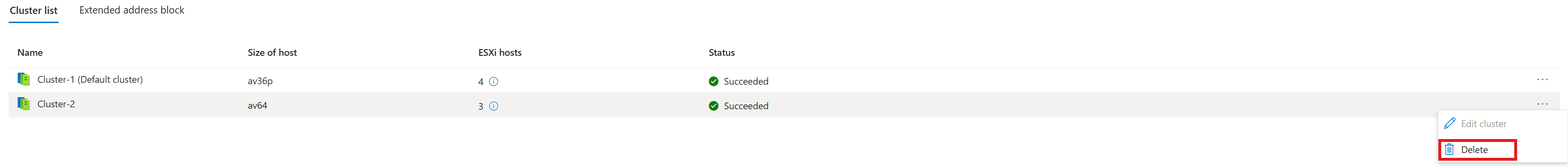 Screenshot, der zeigt, wie Sie einen Cluster in eine private Azure VMware Solution-Cloud löschen.