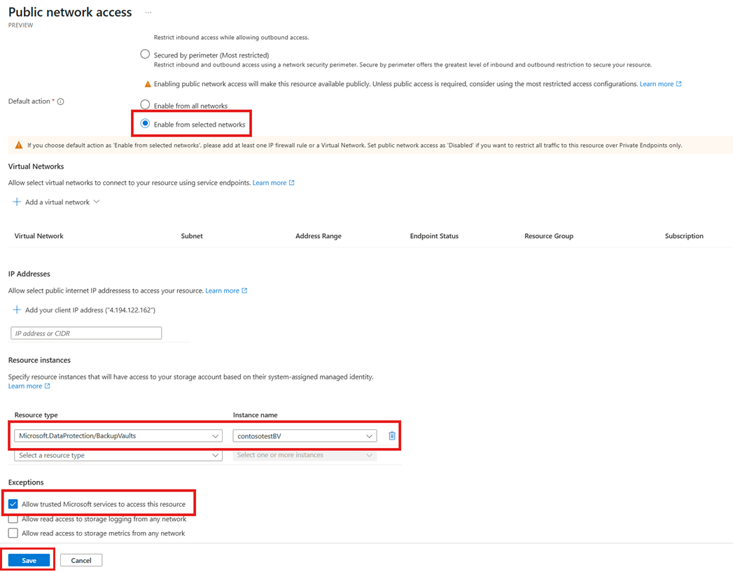 Microsoft.DataProtection/BackupVaults, und wählen Sie dann den Sicherungstresor aus, in dem Ihre Sicherung gespeichert ist.Wählen Sie unter "Ausnahmen" die Option "Vertrauenswürdige Microsoft-Dienste für den Zugriff auf diese Ressource zulassen" aus.