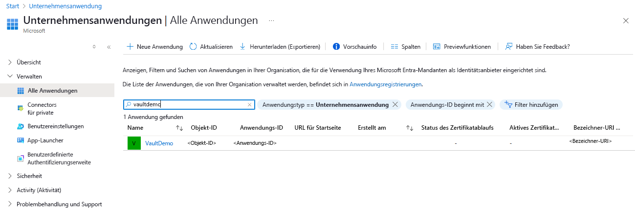 Ersetzen Sie den Wert des assignee Parameters durch die Anwendungs-ID der verwalteten Identität des Tresors. Für den Wert des scope Parameters verweisen Sie auf Ihren spezifischen Container. Um die Anwendungs-ID der verwalteten Identität des Tresors abzurufen, wählen Sie "Alle Anwendungen " unter "Anwendungstyp" aus. Suchen Sie nach dem Tresornamen, und kopieren Sie den Anwendungs-ID Wert.
