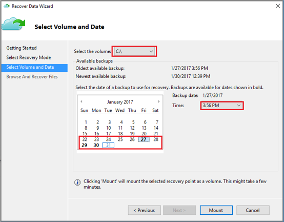 Wählen Sie auf der Seite " Volume und Datum auswählen " das Volume aus, das die Dateien oder Ordner enthält, die Sie wiederherstellen möchten, und wählen Sie "Bereitstellen" aus. Wählen Sie ein Datum aus, und wählen Sie eine Uhrzeit aus dem Dropdownmenü aus, das einem Wiederherstellungspunkt entspricht. Wenn Datumsangaben fett angezeigt werden, ist dies ein Hinweis darauf, dass mindestens ein Wiederherstellungszeitpunkt mit diesem Datum verfügbar ist.