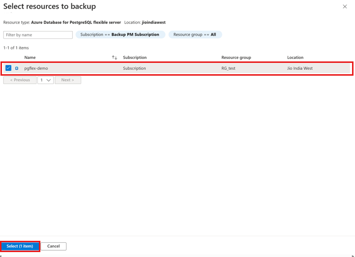 Wählen Sie im Bereich "Ressourcen zum Sichern auswählen " die Option "Azure PostgreSQL – Flexible Server" aus, die gesichert werden sollen, und klicken Sie dann auf "Auswählen".