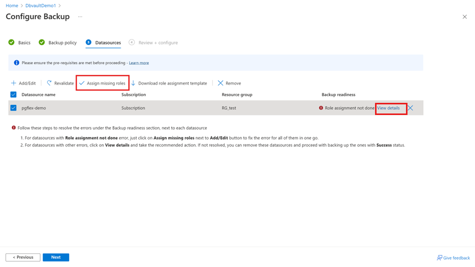 Rollenzuweisung nicht erledigt: Diese Meldung wird angezeigt, wenn Sie (der Sicherungsadministrator) über den Schreibzugriff auf die PostgreSQL verfügen – flexibler Server, um fehlende Berechtigungen zuzuweisen, wie unter "Details anzeigen" aufgeführt. Um Berechtigungen für den PostgreSQL-flexiblen Server inline zu erteilen, wählen Sie "Fehlende Rollen zuweisen" aus.