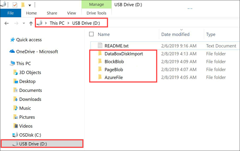 Kopieren Sie die Daten in Ordner, die das richtige Datenformat aufweisen. Kopieren Sie beispielsweise unstrukturierte Daten in den Ordner BlockBlob, VHD- oder VHDX-Daten in den Ordner PageBlob und Dateien in den Ordner AzureFile. Falls das Datenformat nicht mit dem entsprechenden Ordner (Speichertyp) übereinstimmt, tritt für den Datenupload in Azure während eines späteren Schritts ein Fehler auf.
