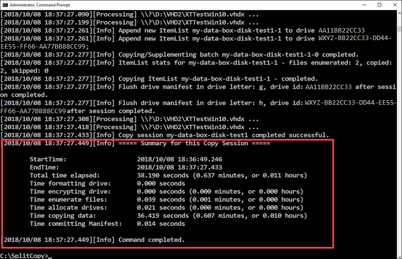Nach dem Aufteilen und Kopieren des Datasets wird wie in der folgenden Beispielausgabe dargestellt eine Zusammenfassung des Tools zum Aufteilen/Kopieren für die Kopiersitzung angezeigt.