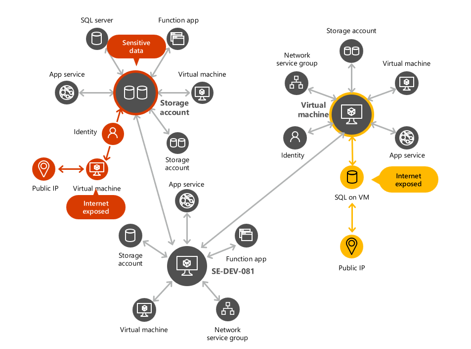 Ein Angriffspfad umfasst eine Reihe von Schritten, die ein potenzieller Angreifer durchführen kann, um Ihre Umgebung zu verletzen und auf Ihre Ressourcen zuzugreifen. Angriffspfade konzentrieren sich auf echte, extern gesteuerte und exploitable Bedrohungen, die Angreifer verwenden könnten, um Ihre Organisation zu kompromittieren. Ein Angriffspfad beginnt an einem externen Einstiegspunkt, z. B. an einer durch das Internet verfügbar gemachten anfälligen Ressource. Der Angriffspfad folgt der verfügbaren lateralen Bewegung innerhalb Ihrer Multicloud-Umgebung, z. B. mithilfe angefügter Identitäten, die über Berechtigungen für andere Ressourcen verfügen. Der Angriffspfad wird fortgesetzt, bis der Angreifer ein kritisches Ziel erreicht, z. B. Datenbanken, die vertrauliche Daten enthalten.