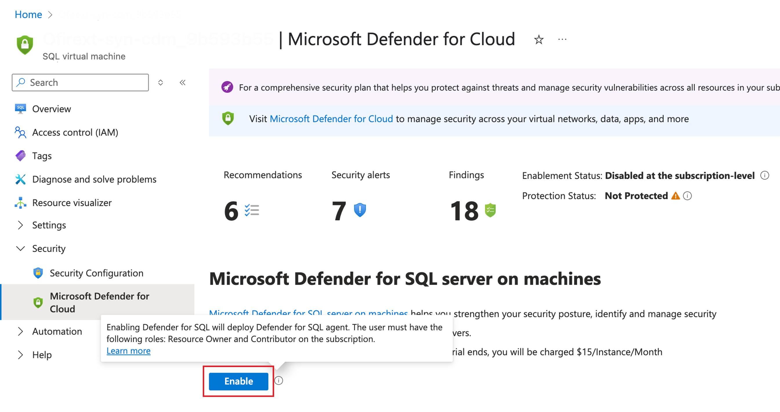 Wählen Sie "Microsoft Defender für SQL-Server auf Computern aktivieren" aus.