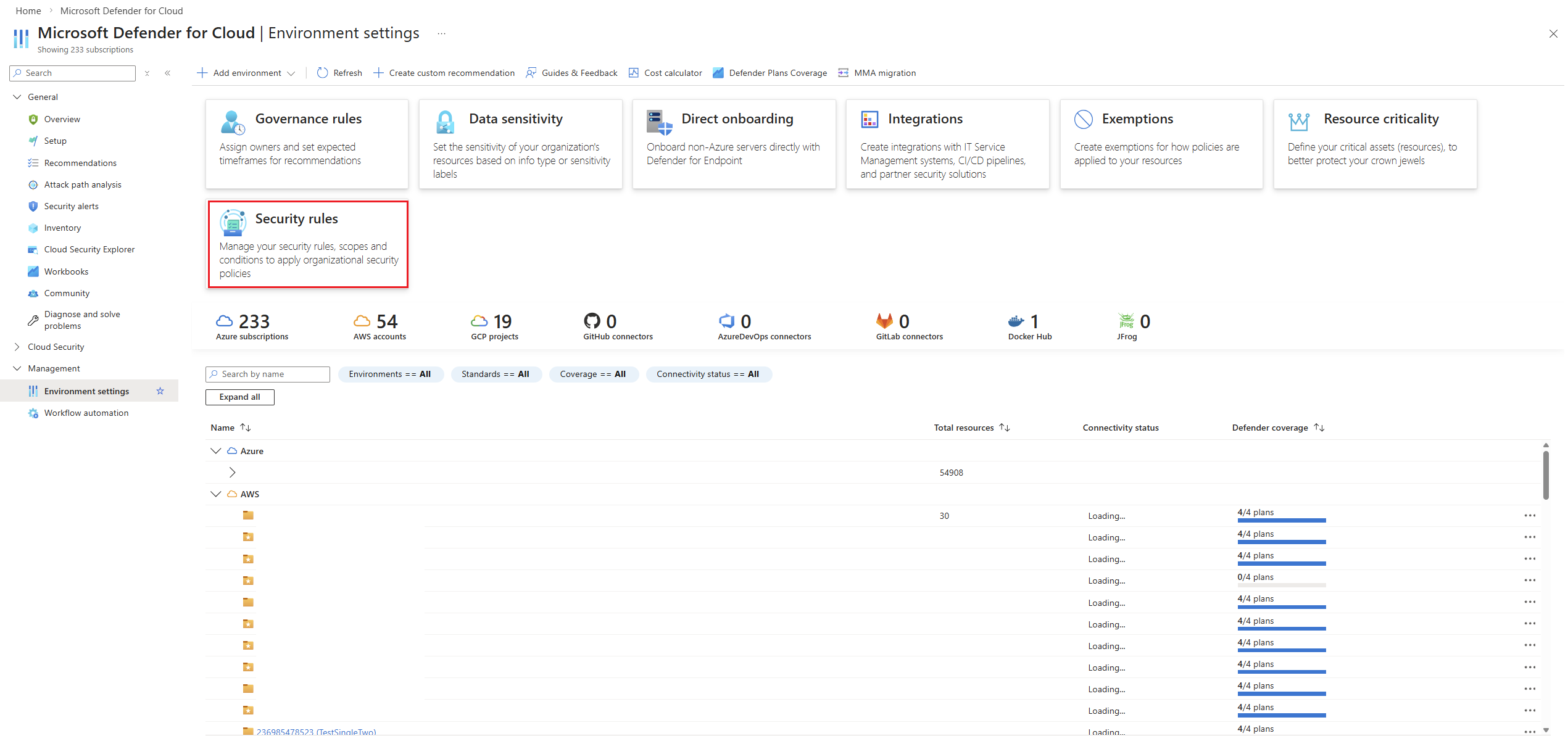 - Wählen Sie im Bereich "Einstellungen für Microsoft Defender for Cloud Environment"Die Sicherheitsregeln aus.