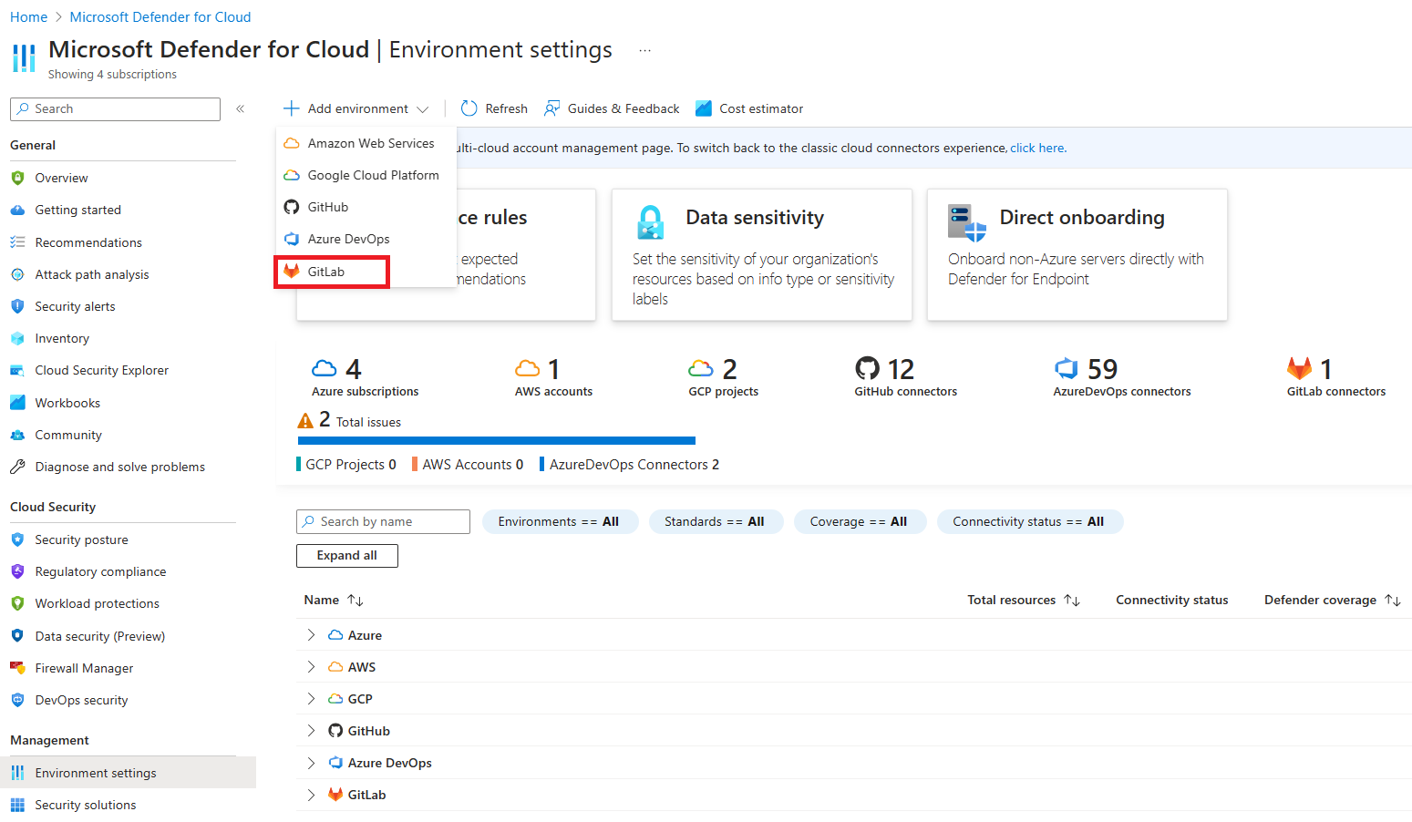 In dieser Schnellstartanleitung verbinden Sie Ihre GitLab-Gruppen auf der Seite Umgebungseinstellungen in Microsoft Defender for Cloud. Diese Seite bietet eine einfache Onboarding-Erfahrung zur automatischen Ermittlung Ihrer GitLab-Ressourcen.