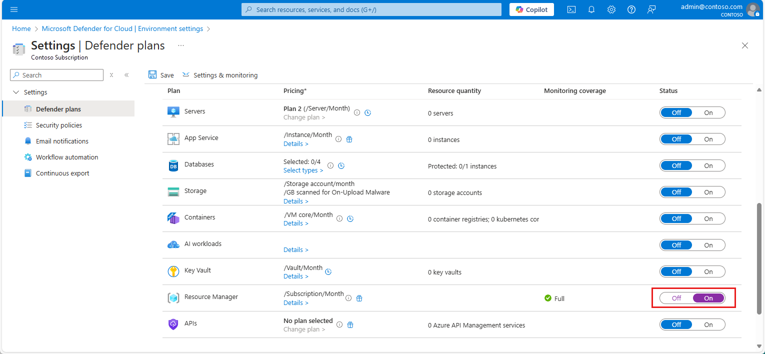So aktivieren Sie den Defender for Resource Manager-Plan für Ihr Abonnement: