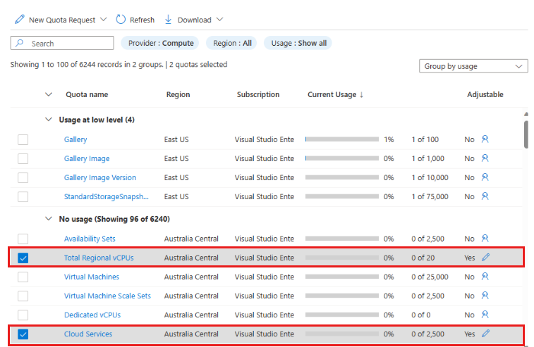 Wählen Sie unter Nutzung + Kontingente die Kontingente aus, die Sie erhöhen möchten.
