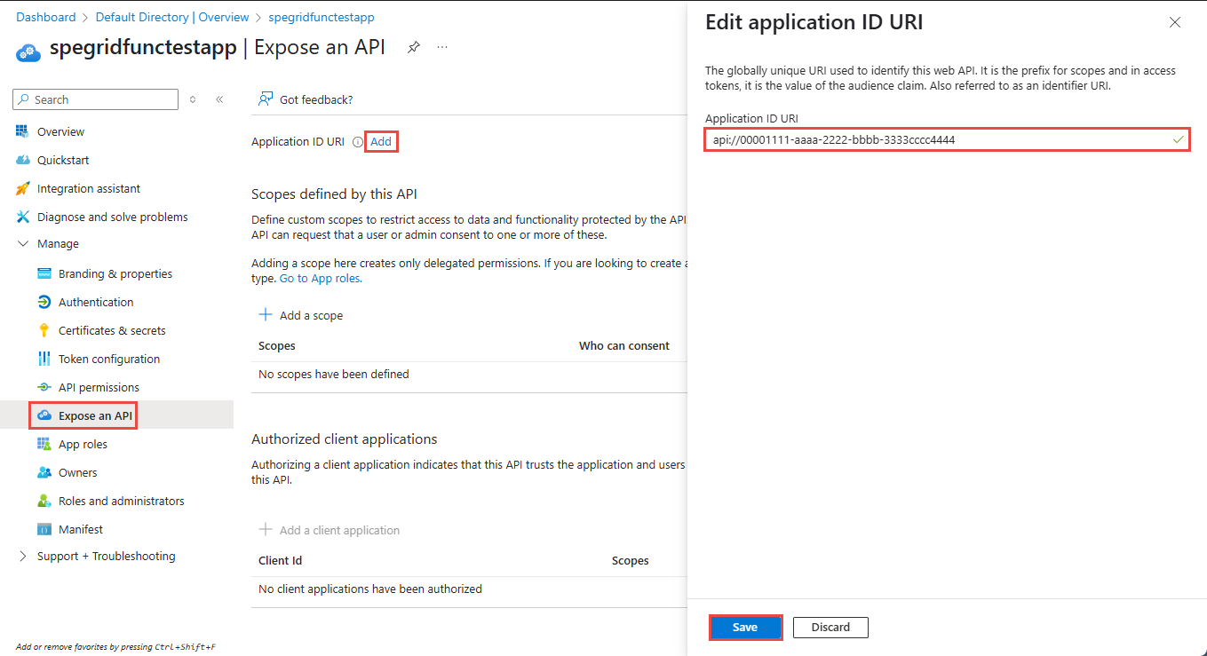 Notieren Sie sich den Wert für Anwendungs-ID-URI im Bereich Anwendungs-ID-URI bearbeiten, und wählen Sie dann Speichern aus.