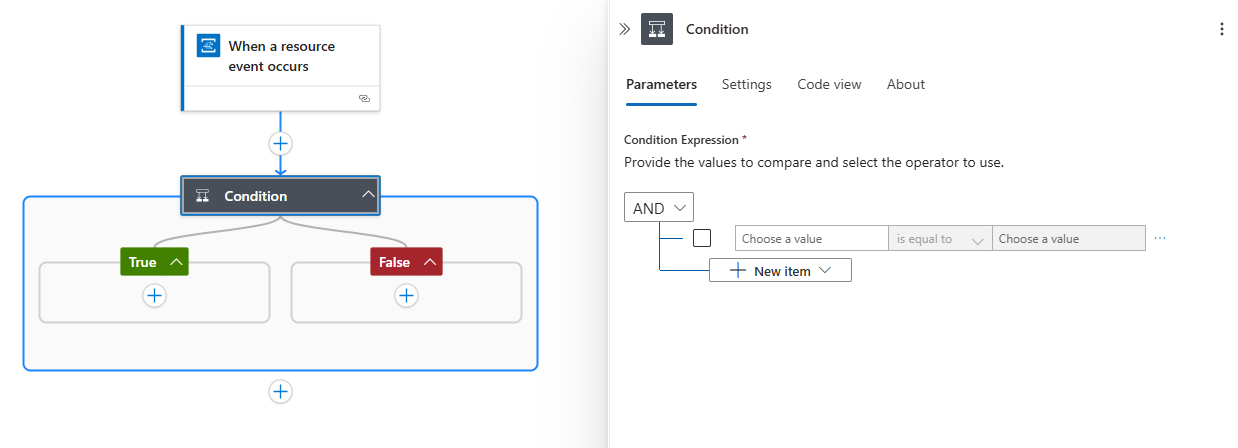 Damit die Aktionen in Ihrem Workflow nur dann ausgeführt werden, wenn ein bestimmtes Ereignis oder ein bestimmter Vorgang eintritt, fügen Sie eine Bedingung hinzu, die auf dieses Ereignis oder diesen Vorgang prüft. In diesem Tutorial wird auf den Vorgang Microsoft.Compute/virtualMachines/write geprüft. Wenn diese Bedingung zutrifft, sendet Ihnen eine andere Aktion im Workflow eine E-Mail mit Informationen zum aktualisierten virtuellen Computer.