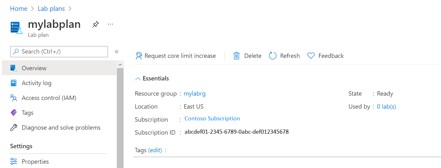 Wählen Sie im Azure-Portal auf der Seite Übersicht für den Labplan Ressourcengruppe aus.