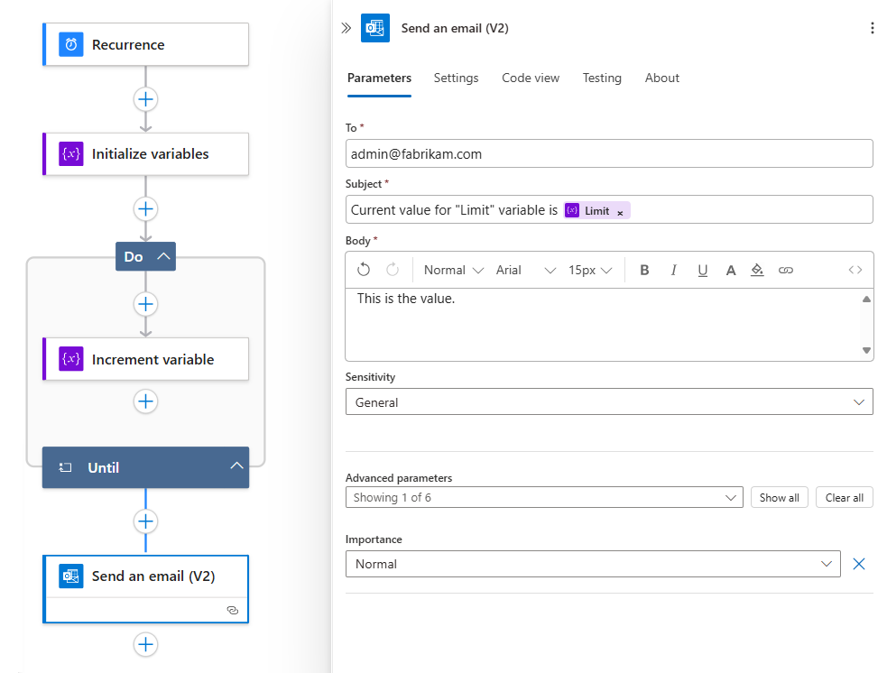 Parameter Wert Begrenzung Wählen Sie die Variable Limit aus. Wert 1 Führen Sie außerhalb und unter der Aktion Until die folgenden allgemeinen Schritte aus, um eine Aktion hinzuzufügen, die E-Mails in Ihrem Logik-App-Workflow Verbrauch oder Standard sendet.