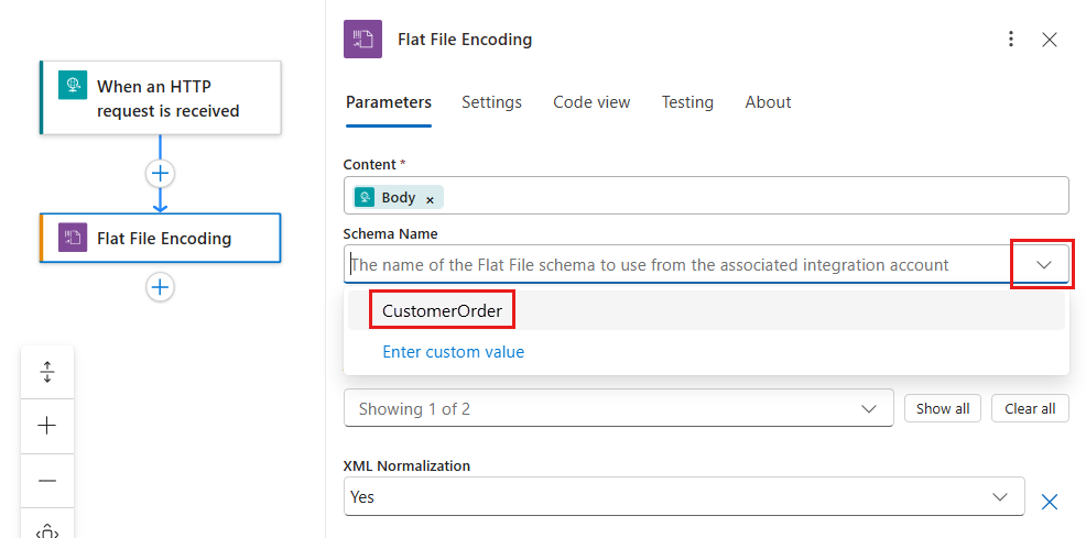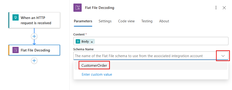 In Standardworkflows können Sie mit Flat File-Vorgängen ein Schema aus einem verknüpften Integrationskonto auswählen oder das Sie zuvor in Ihre Logik-App hochgeladen haben, aber nicht beides.