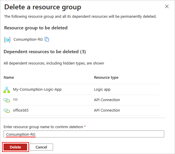 Wenn der Bestätigungsbereich angezeigt wird, geben Sie den Ressourcengruppennamen ein, und wählen Sie Löschen aus.
