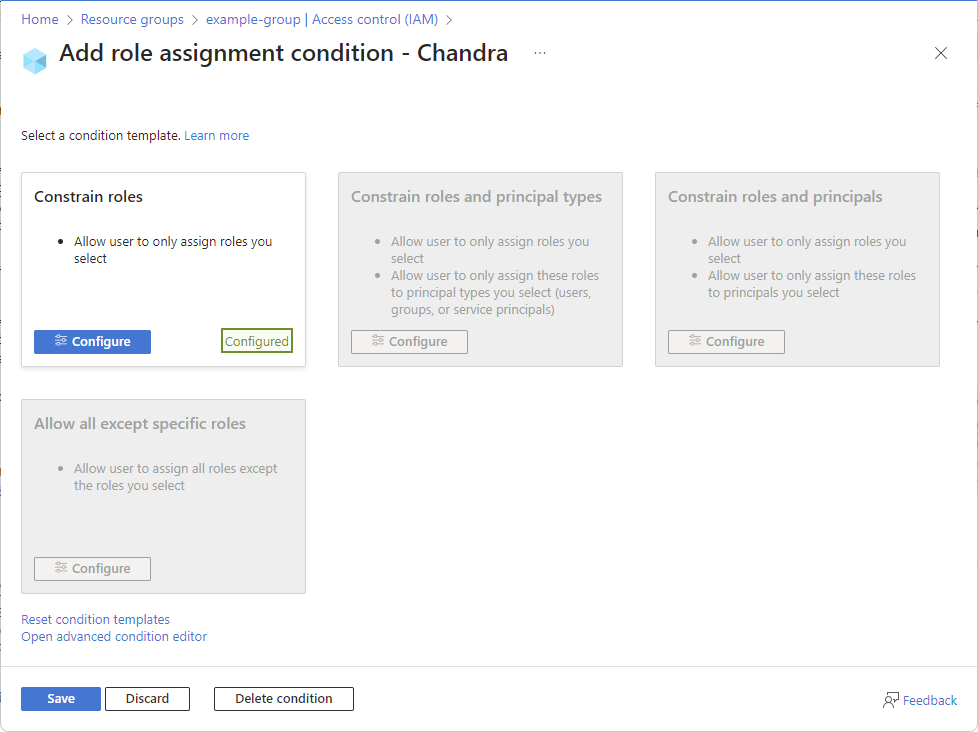 Sie haben eine Bedingung mithilfe einer Vorlage erstellt, die in Delegieren der Azure-Rollenzuweisungsverwaltung an andere unter Berücksichtigung von Bedingungen beschrieben wird. Wenn Sie versuchen, die Bedingung zu bearbeiten, wird der erweiterte Bedingungs-Editor angezeigt.