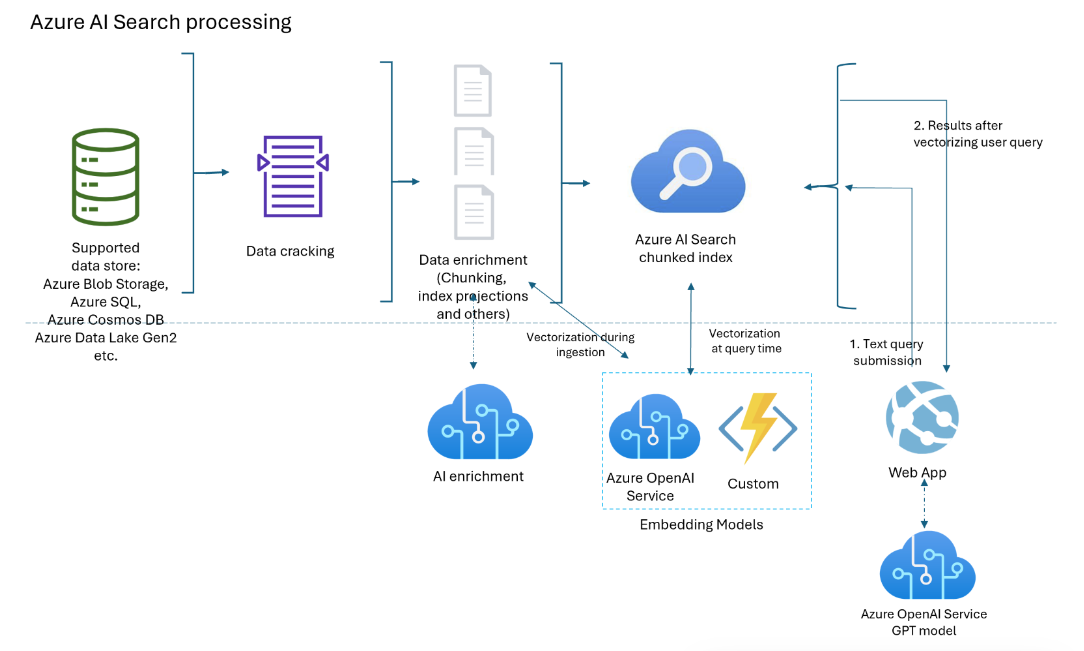 Das Diagramm konzentriert sich auf die integrierte Vektorisierung. Ihre Lösung ist jedoch nicht auf diese Liste beschränkt. Sie können weitere Skills für die KI-Anreicherung hinzufügen, einen Wissensspeicher erstellen und eine semantische Rangfolge sowie Relevanzoptimierung und weitere Abfragefeatures hinzufügen.