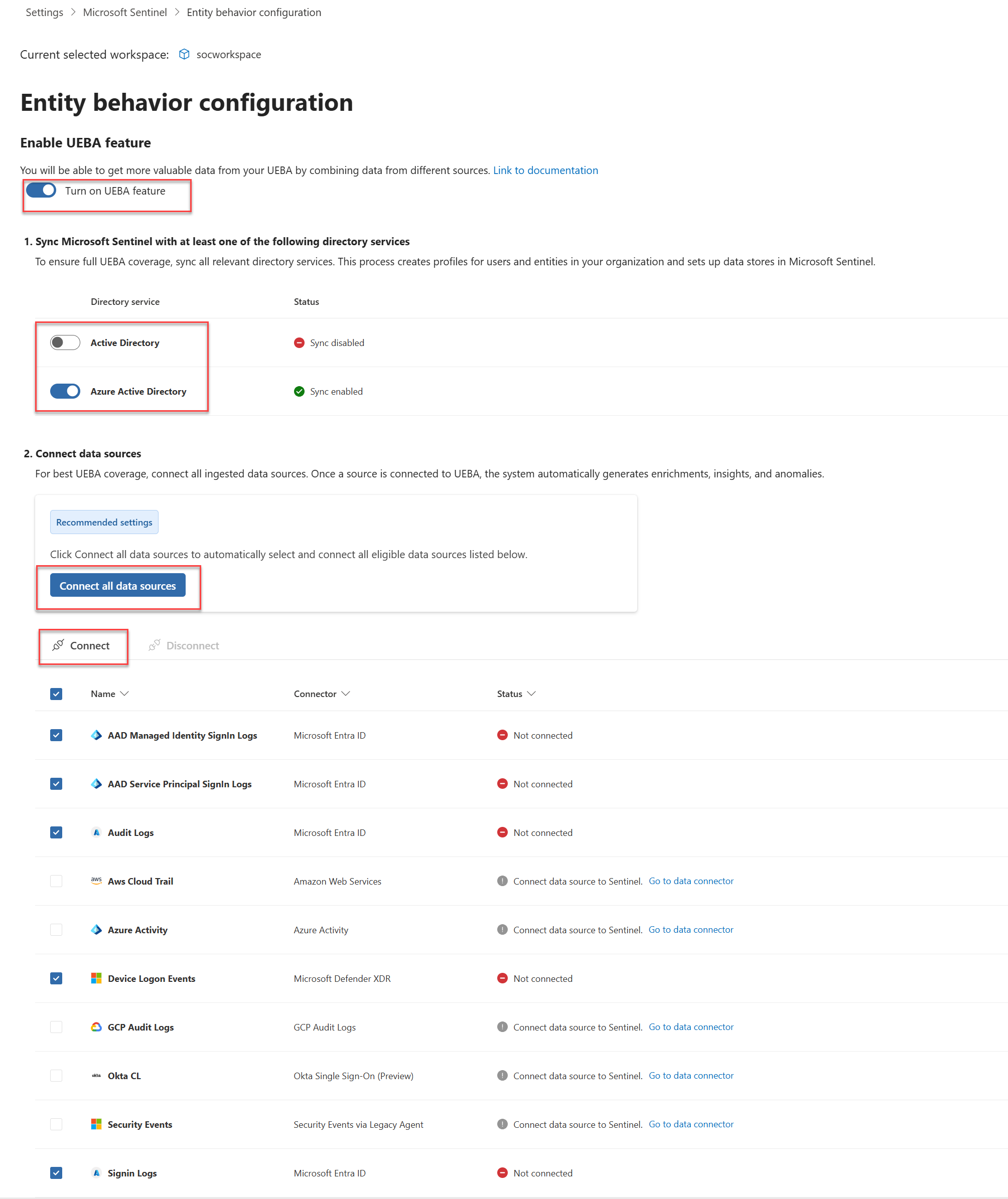 • Aktivieren Sie in den Microsoft Sentinel-Arbeitsbereichseinstellungen UEBA für Ihren Arbeitsbereich, und wählen Sie aus, welche Datenquellen im Microsoft Defender-Portal oder azure-Portal verbunden werden sollen.