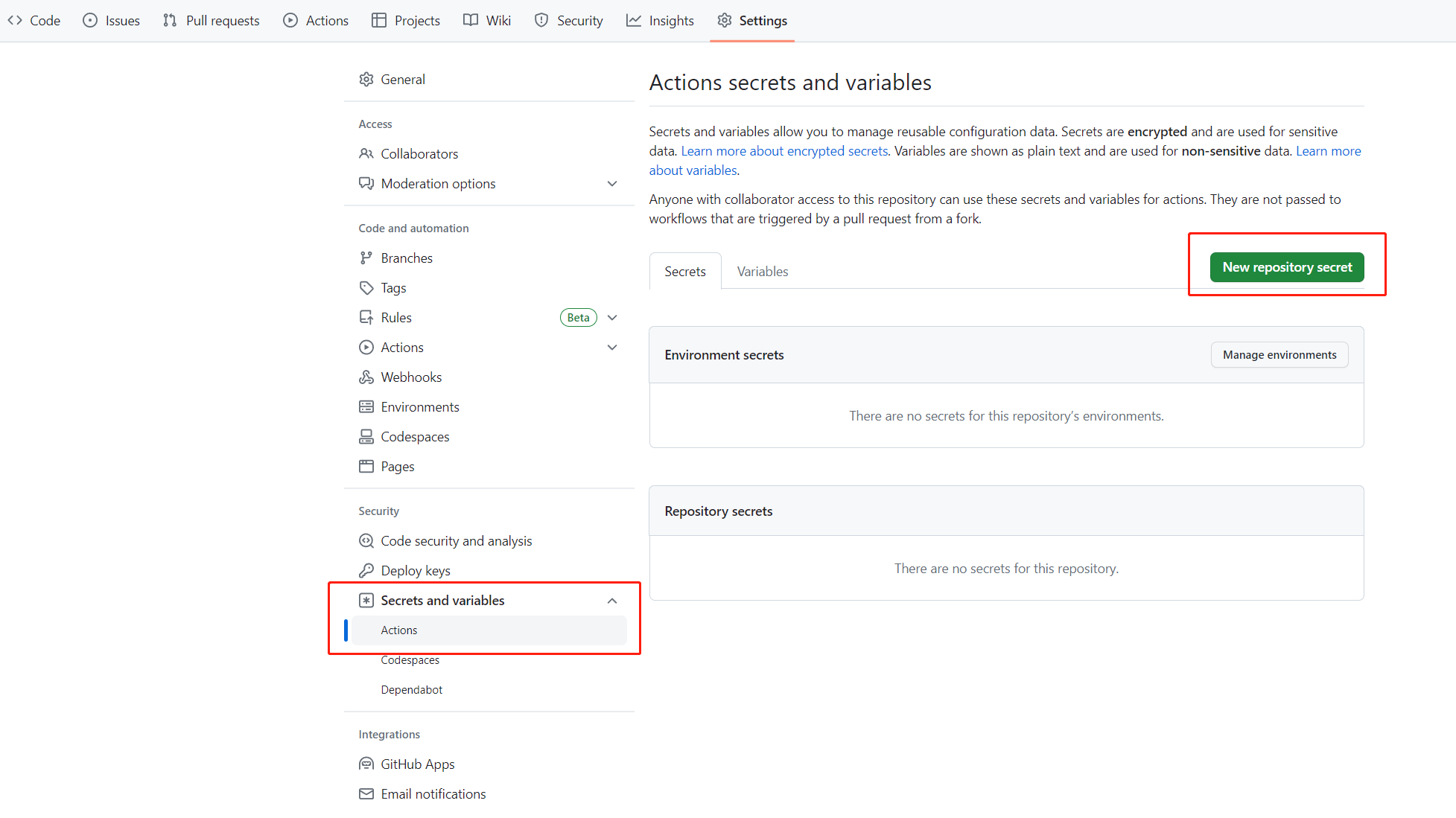 In diesem Beispiel wird das Steeltoe-Beispiel auf GitHub verwendet. Forken Sie das Repository, öffnen Sie die GitHub-Repositoryseite für den Fork, und wählen Sie die Registerkarte Settings (Einstellungen) aus. Öffnen Sie das Menü Secrets (Geheimnisse), und wählen Sie New secret (Neues Geheimnis) aus: