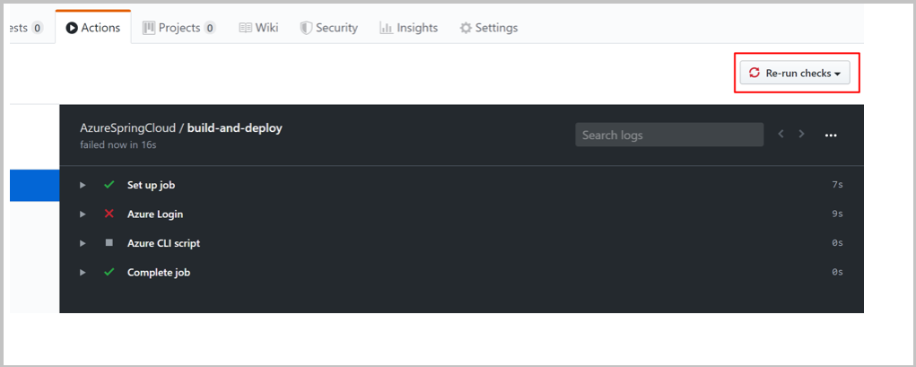 Im Falle eines Aktionsfehlers (beispielsweise, wenn die Azure-Anmeldeinformationen nicht festgelegt wurden) können Sie die Überprüfungen erneut ausführen, nachdem Sie den Fehler behoben haben. Klicken Sie auf der GitHub-Repositoryseite auf Aktionen, wählen Sie die spezifische Workflowaufgabe aus, und klicken Sie auf die Schaltfläche Rerun checks (Überprüfungen erneut ausführen), um die Überprüfungen erneut auszuführen: