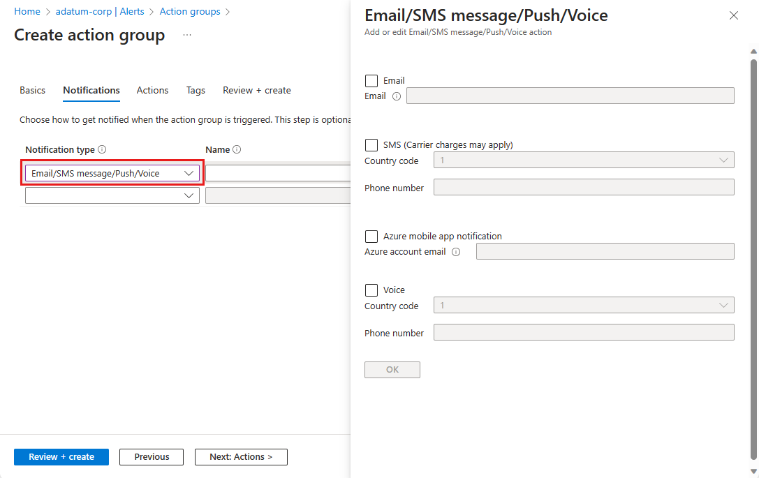 Wählen Sie die Registerkarte Benachrichtigungen und dann im Dropdownmenü einen Benachrichtigungstyp aus. Durch diese Aktion wird ein Bereich geöffnet, in dem Sie die Aktion festlegen können, die bei Aktivierung ausgeführt wird. Dieses Beispiel zeigt einen E-Mail- und SMS-Typ. Füllen Sie das Formular aus, und wählen Sie OK aus.