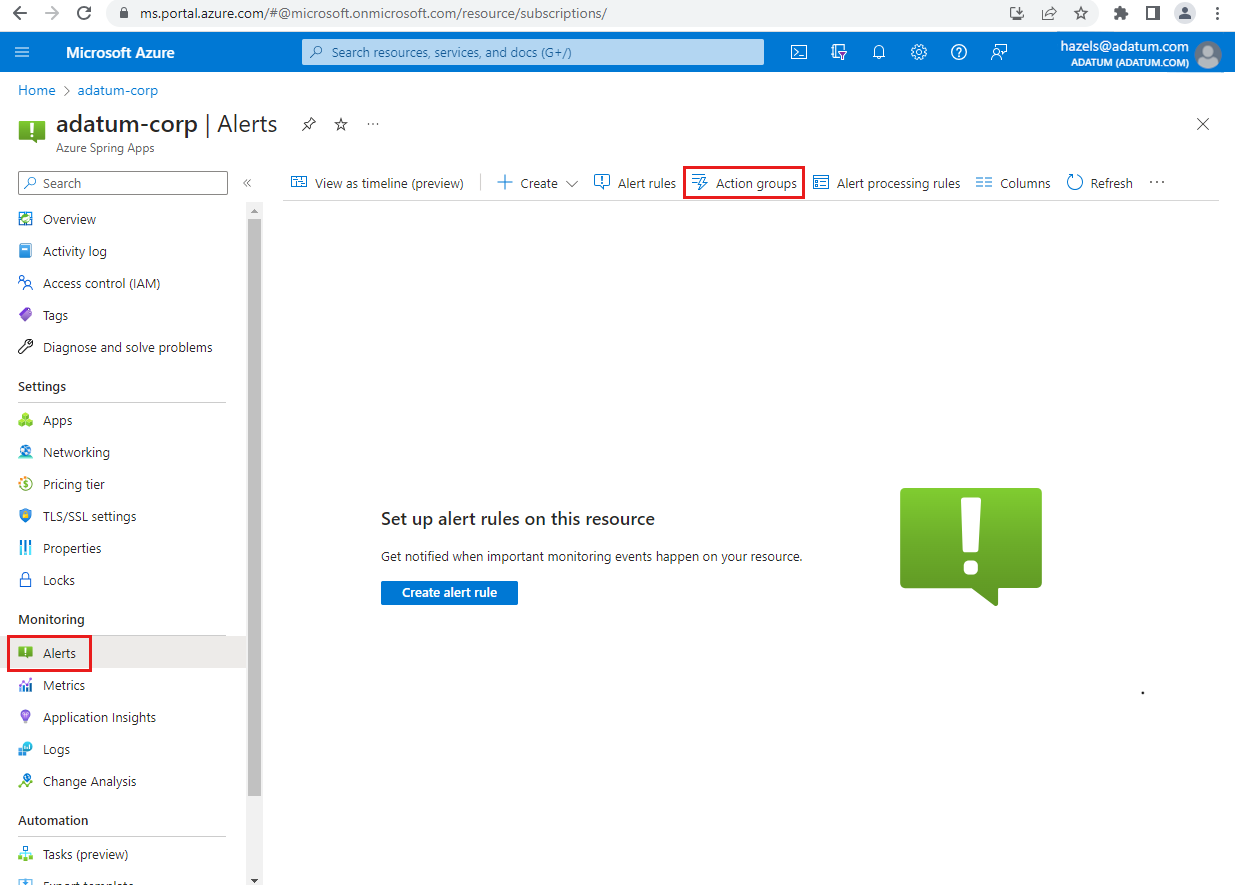 In diesem Artikel haben Sie erfahren, wie Sie Warnungen und Aktionsgruppen für eine Anwendung in Azure Spring Apps einrichten. Hier erfahren Sie mehr über Aktionsgruppen: