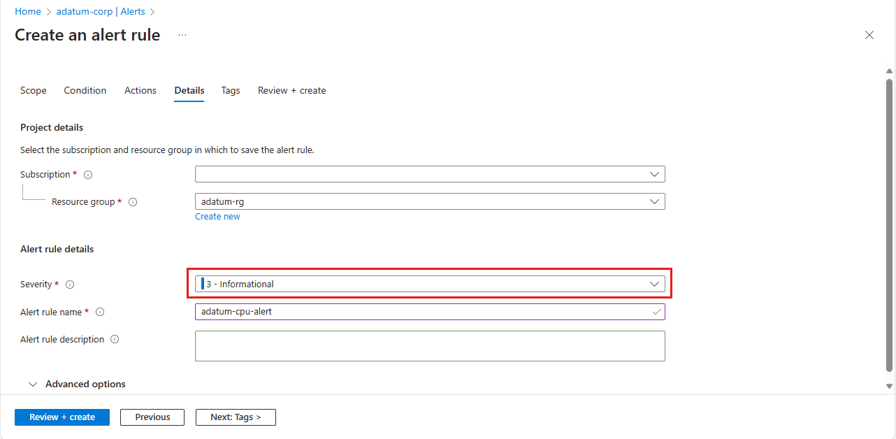 Wählen Sie die Registerkarte Details aus, legen Sie Schweregrad fest, und nehmen Sie alle anderen erforderlichen Änderungen vor.