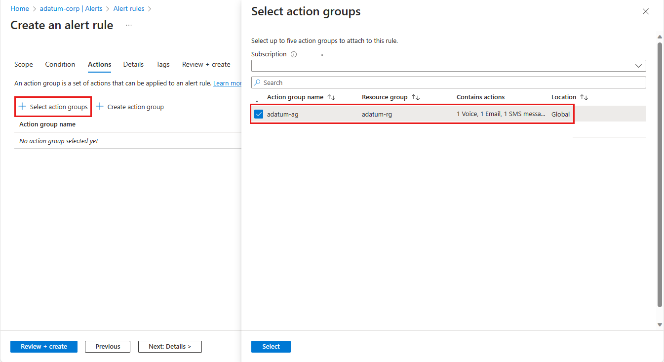 Wählen Sie die Registerkarte Aktionen und dann Aktionsgruppe auswählen aus. Wählen Sie im Bereich Aktionsgruppen auswählen die Aktionsgruppe aus, die von der Regel ausgelöst werden soll, z. B. die zuvor definierte Aktionsgruppe.
