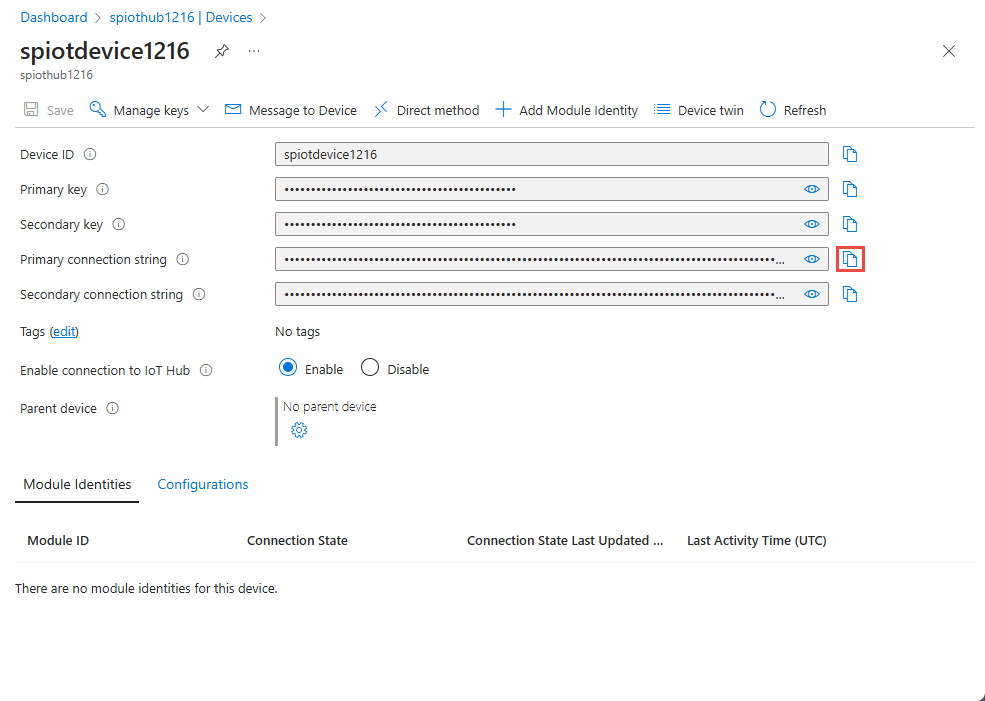 Wählen Sie auf der Geräteseite die Schaltfläche „Kopieren“ neben Primäre Verbindungszeichenfolge aus, und speichern Sie die Kopie in einem Editor, um sie später zu verwenden.