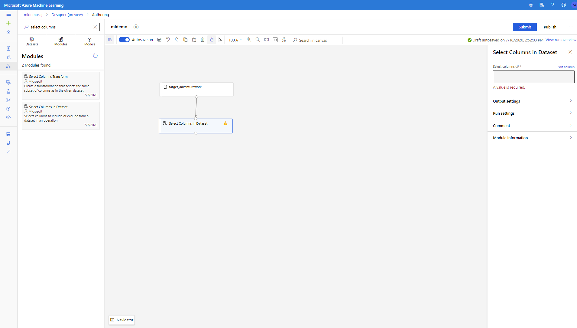 Ziehen Sie die Komponente Select Columns in Dataset unter Data Transformation < Manipulation in den Zeichenbereich. Verbinden Sie diese Komponente mit der Komponente Dataset.