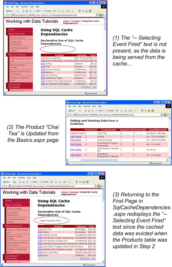 Diese Verzögerung wird wahrscheinlicher angezeigt, wenn Sie eines der Produkte über das GridView-Element SqlCacheDependencies.aspxbearbeiten. Im Lernprogramm "Caching Data in der Architektur" haben wir die MasterCacheKeyArray Cacheabhängigkeit hinzugefügt, um sicherzustellen, dass die Daten, die über die Methode der ProductsCL Klasse UpdateProduct bearbeitet werden, aus dem Cache entfernt werden. Diese Cacheabhängigkeit wurde jedoch beim Ändern der AddCacheItem Methode weiter oben in diesem Schritt ersetzt. Daher zeigt die ProductsCL Klasse weiterhin die zwischengespeicherten Daten an, bis das Abrufsystem die Änderung an der Products Tabelle notiert. In Schritt 7 wird gezeigt, wie Die MasterCacheKeyArray Cacheabhängigkeit erneut eingeführt wird.