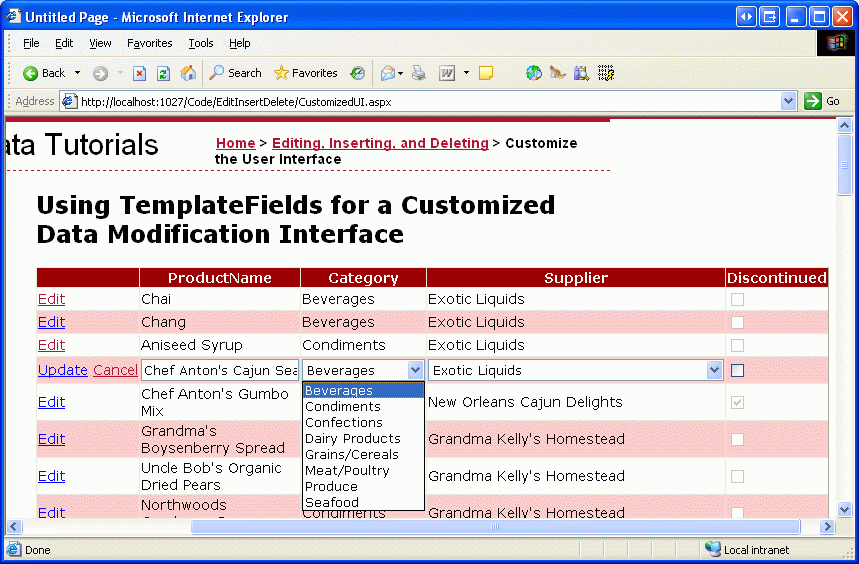 Nachdem die Bindungen auf die SelectedValue Eigenschaften der beiden DropDownLists angewendet wurden, werden die Kategorie- und Lieferantenspalten des bearbeiteten Produkts standardmäßig auf die Werte des aktuellen Produkts angewendet. Beim Klicken auf "Aktualisieren" werden die CategoryID Werte und SupplierID Werte des ausgewählten Dropdownlistenelements an die UpdateProduct Methode übergeben. Abbildung 11 zeigt das Lernprogramm, nachdem die Datenbindungsanweisungen hinzugefügt wurden; beachten Sie, wie die ausgewählten Dropdownlistenelemente für Chef Antons Cajun Seasoning korrekt condiment und New Orleans Cajun Delights sind.