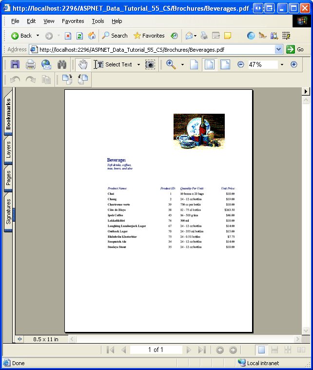 Mit dieser Seite erstellt, kann ein bestimmtes Kategoriebild durch Besuch DisplayCategoryPicture.aspx?CategoryID=categoryIDangezeigt werden. Abbildung 11 zeigt das Bild der Kategorie Getränke, das angezeigt DisplayCategoryPicture.aspx?CategoryID=1werden kann.