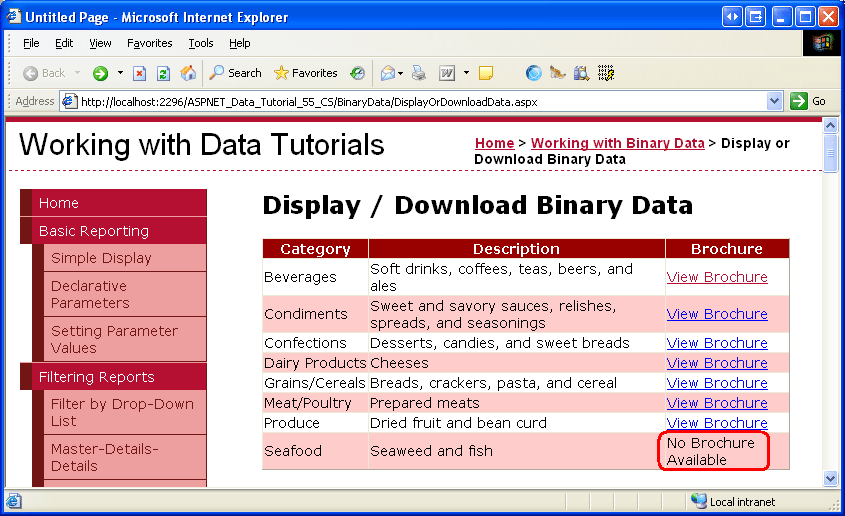 Zeigen Sie diese Seite über einen Browser an (siehe Abbildung 5). Jede der acht Kategorien wird aufgelistet. Die sieben Kategorien mit BrochurePath Werten haben den Wert, der BrochurePath im jeweiligen BoundField angezeigt wird. Meeresfrüchte, die einen NULL Wert für sie BrochurePathhaben, zeigt eine leere Zelle an.