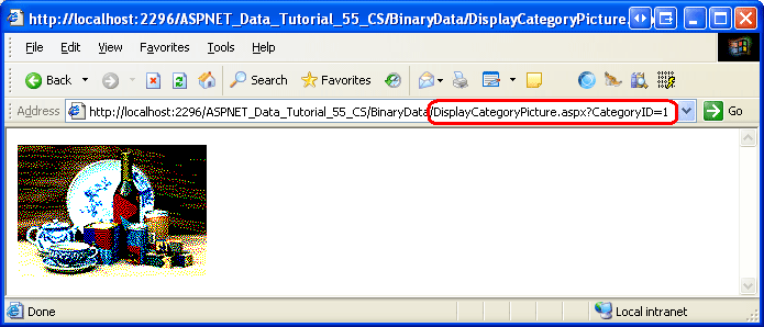 Da wir nun eine Webseite zum Anzeigen eines bestimmten Kategoriebilds haben, können wir es entweder mit dem Bildwebsteuerelement oder mit einem HTML-Element <img> anzeigen, das auf DisplayCategoryPicture.aspx?CategoryID=categoryID zeigt. Bilder, deren URL durch Datenbankdaten bestimmt wird, können in GridView oder DetailsView mithilfe des ImageField angezeigt werden. Das ImageField enthält DataImageUrlField und DataImageUrlFormatString Eigenschaften, die wie hyperLinkFields DataNavigateUrlFields und DataNavigateUrlFormatString Eigenschaften funktionieren.
