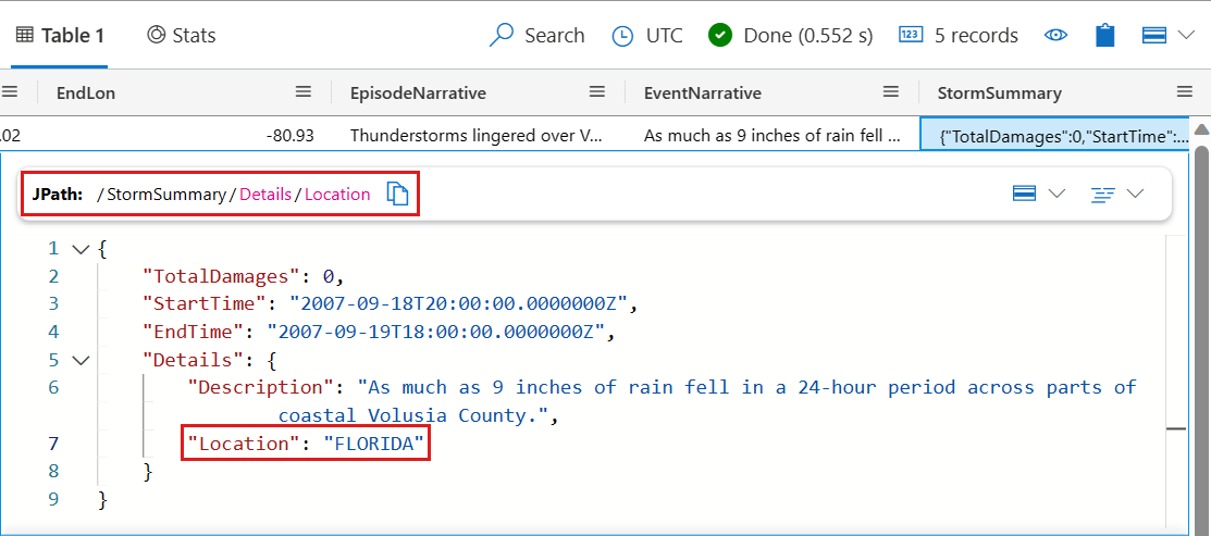 StormSummarySpalte aus, die die letzte Spalte sein soll.Wählen Sie verschiedene Felder innerhalb des Ergebnisses aus, und sehen Sie, wie sich das JPATH oben im Fenster ändert. Der folgende Screenshot zeigt beispielsweise den Pfad zum