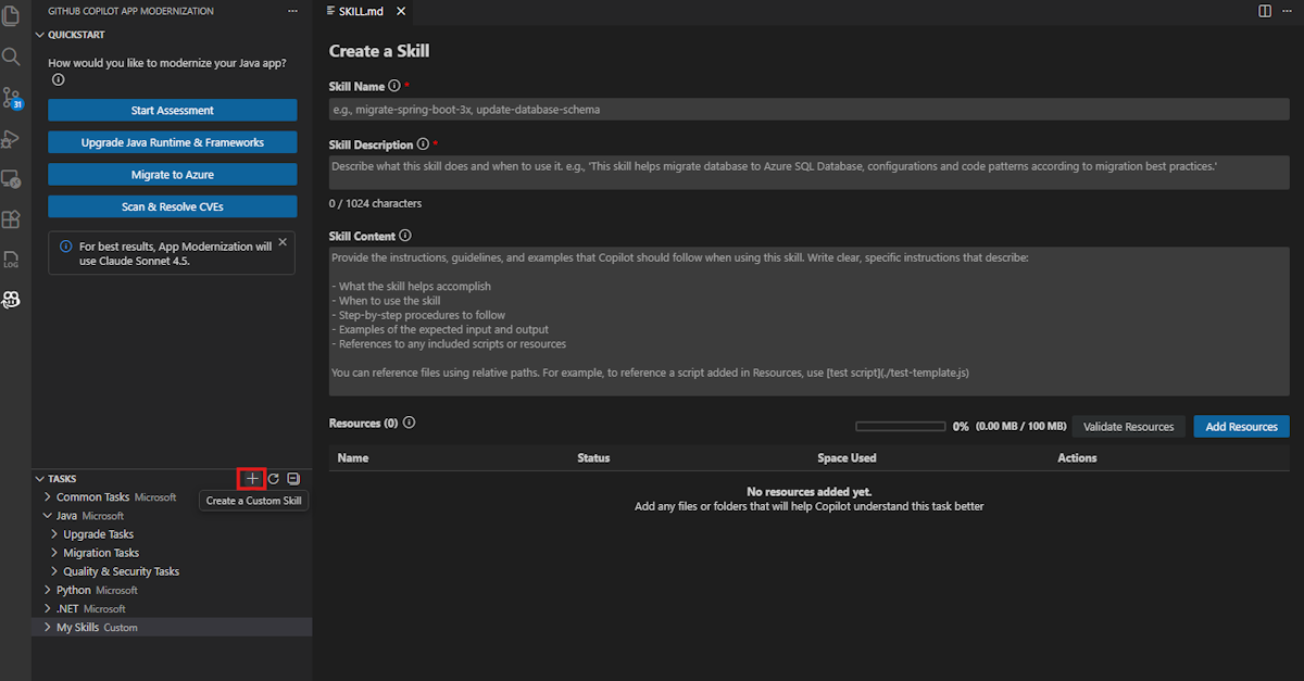 Öffnen Sie in der Aktivitätsseitenleiste den GitHub Copilot Modernisierungs-Extension-Bereich, zeigen Sie auf den Abschnitt TASKS, und wählen Sie dann "Benutzerdefinierte Fähigkeit erstellen" aus.
