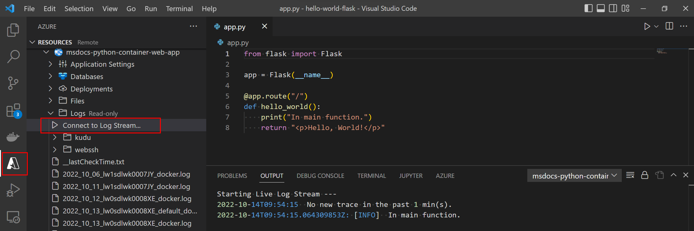 Sehen Sie sich die Protokolle der Containerinstanz an, um daraufhin diagnostische Nachrichten aus dem Code zu erkennen und Probleme im Code Ihres Containers zu beheben. Im Folgenden finden Sie verschiedene Möglichkeiten zum Anzeigen von Protokollen beim Ausführen eines Containers in Ihrer Entwicklungsumgebung: