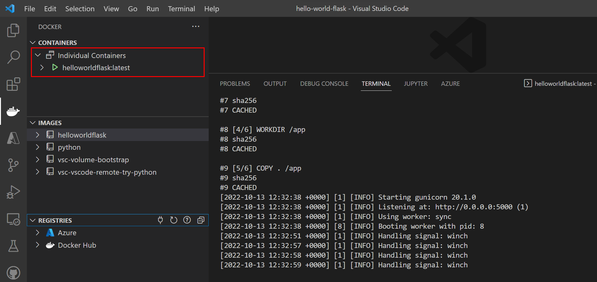 Sie können auch mit Python Docker-Images und -Containern mit der Azure CLI und Docker CLI arbeiten. Sowohl VS Code als auch PyCharm verfügen über Terminals, auf denen Sie diese CLIs ausführen können.