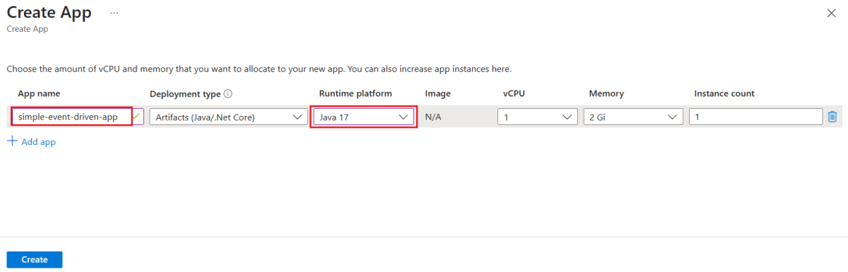 Verwenden Sie auf der Seite App erstellen für den App-Namen simple-event-driven-app, und übernehmen Sie für alle anderen Felder die Standardwerte.