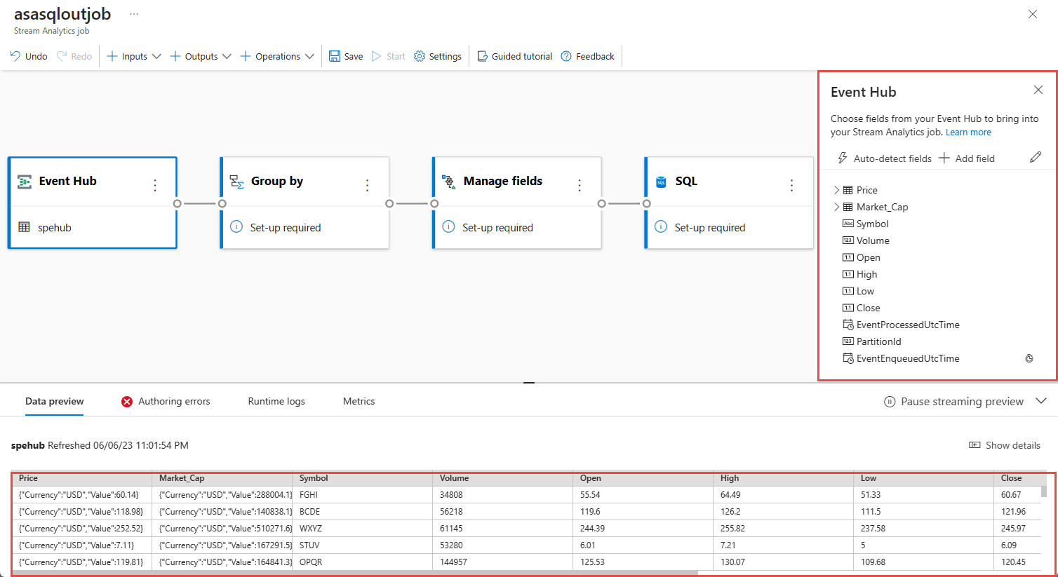 Ein Livebeispiel für eingehende Daten in der Tabelle Datenvorschau unter der Diagrammansicht. Es wird in regelmäßigen Abständen automatisch aktualisiert. Sie können Streamingvorschau anhalten auswählen, um eine statische Ansicht der Beispieleingabedaten anzuzeigen.