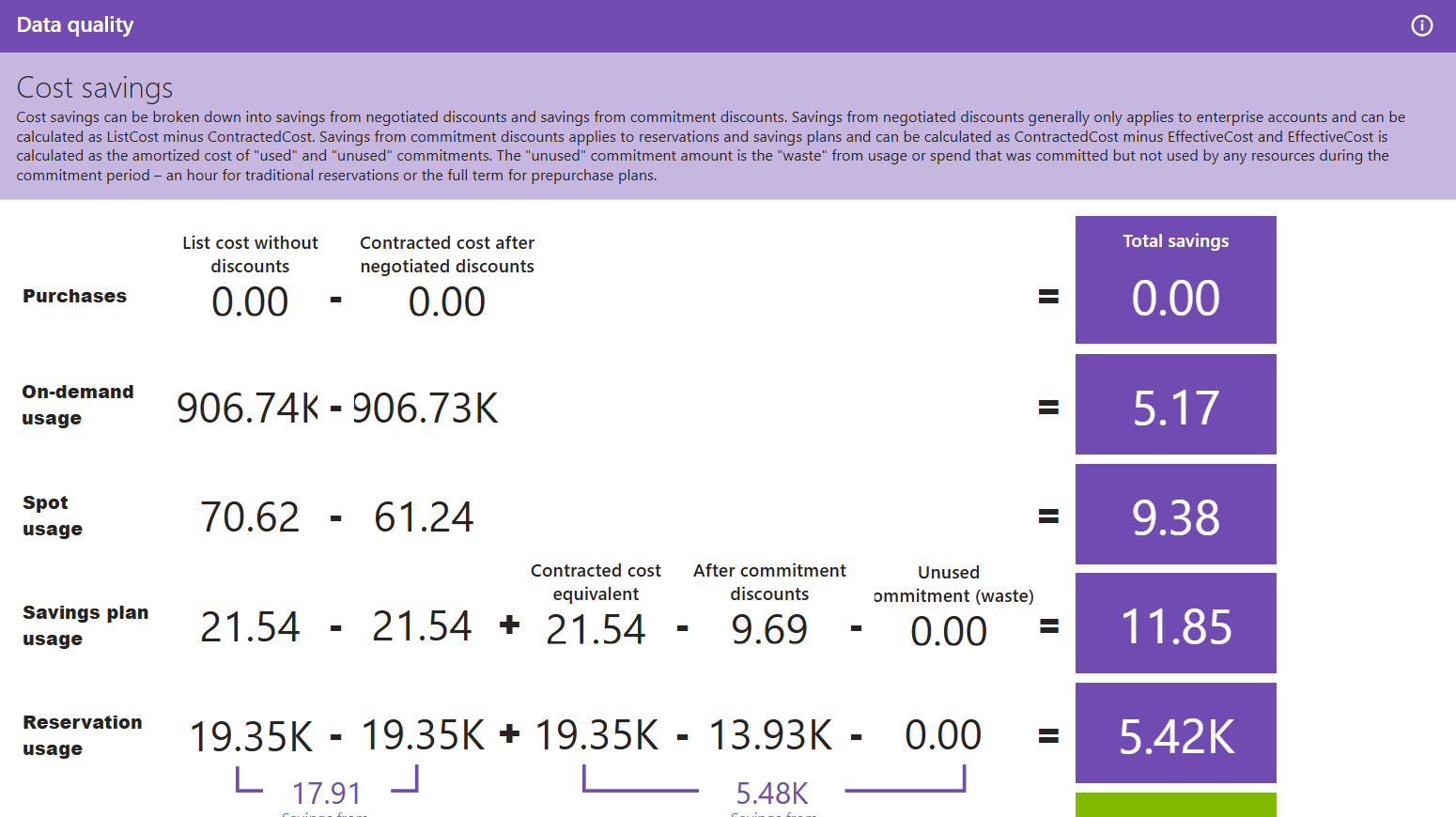 Auf der Seite "Datenqualität " werden einige der Daten angezeigt, die verwendet werden, um Einsparungen auf Kosten- und Einzelpreisniveau zu berechnen. Es kann hilfreich sein, die Daten zu verstehen, aber auch bei der Identifizierung von Problemen in Kostenmanagementdaten, die zu einem unvollständigen Bild von Kosteneinsparungen führen (z. B. fehlende Preis- und Kostenwerte). Wenn Ihnen Daten fehlen, kontaktieren Sie den Support, um die Priorität dieser Bugs im Kostenmanagement zu erhöhen. Diese Seite ist nur in speicherbasierten Berichten verfügbar. Wenn Sie Data Explorer nutzen, verwenden Sie die Data Explorer-Abfragekonsole.