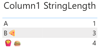 Hier ist ein Vor- und Nachher-Vergleich des Ergebnisses von StringLength in einer Spalte, die Unicode-Zeichen enthält: